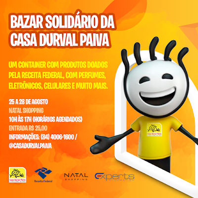 12) O objetivo do bazar é arrecadar fundos para as atividades da Casa de Apoio à Criança com Câncer Durval Paiva e foi possibilitado graças ao apoio da Delegacia da Receita Federal do Rio Grande do Norte;